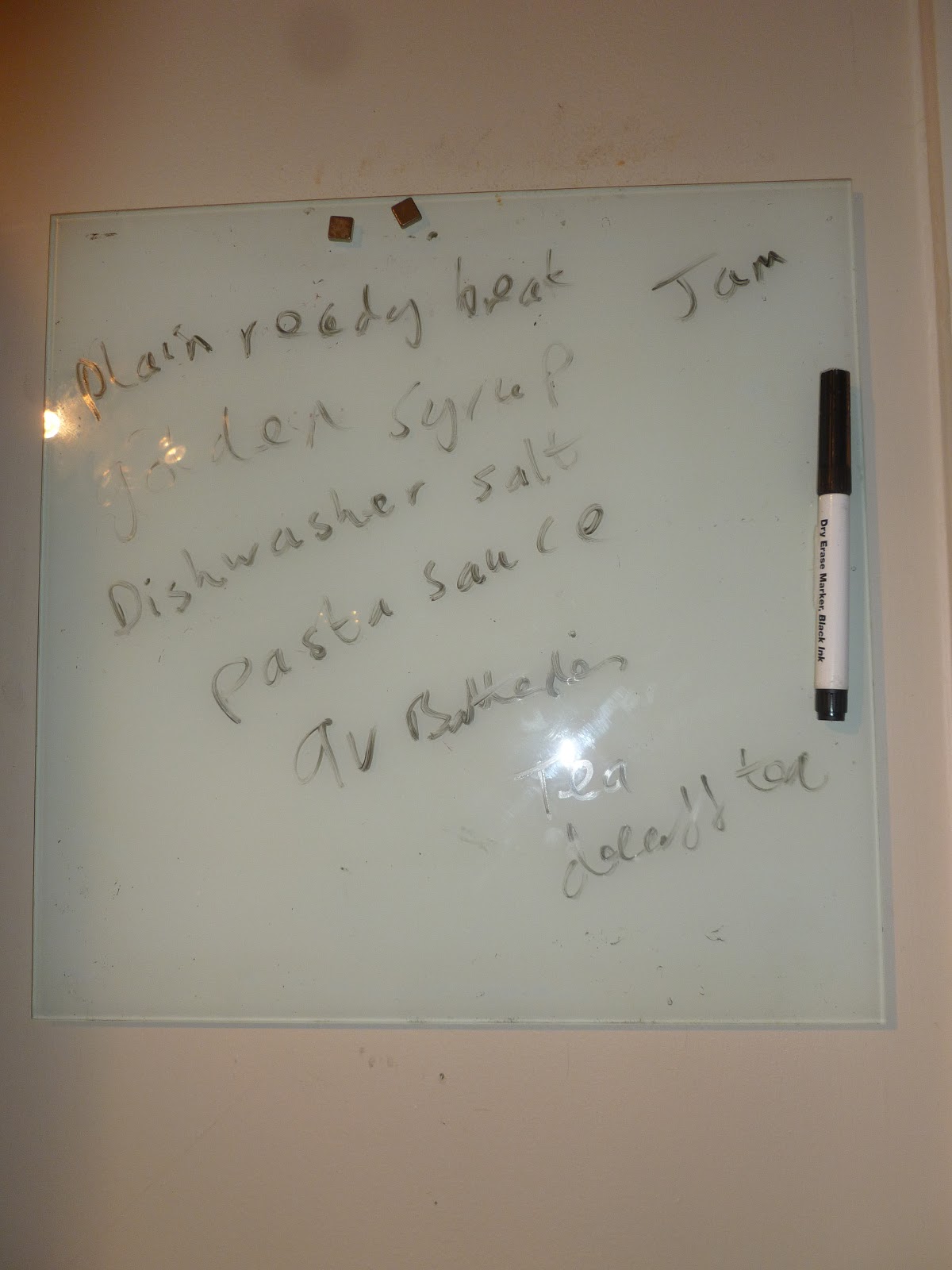 We have a whiteboard in the kitchen. The idea is that you write down what you need when you have run out of it. The problem is that it never came with a pen holder! Nine times out of ten I don't write down what we need because there is no dry wipe pen. Well those days are now gone, as the VELCRO® has come out again. This time in the form of "super slim stick on" Hey presto - I now know where the pen is. And as you can see I should probably be doing an internet grocery shopping order from the length of that list, rather than blogging.