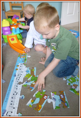 My boys were very happy this week when we received a music for kids jingle puzzle to review. We were given five little speckled frogs. In the box there is a floor jigsaw, sing along CD with a bonus story and an activity booklet with stickers.